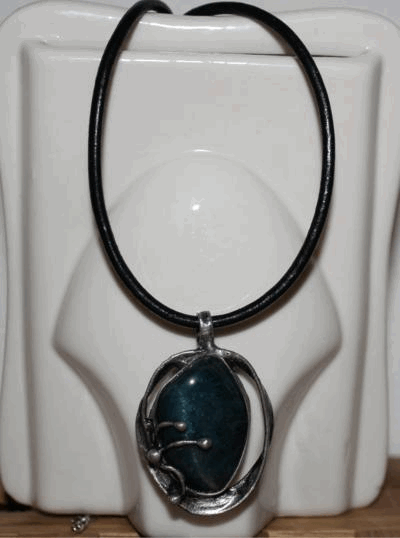 CÍNOVANÝ ŠPERK S APATITEM - na přání Tromlovaný modrý apatit, bezolovnatý cín se stříbrem, černá kulatá kůže 45 cm + 5 cm adjustační řetízek z chirurgické oceli. Přívěsek je patinován, leštěn a ošetřen antioxidantem.   DETAIL1 |