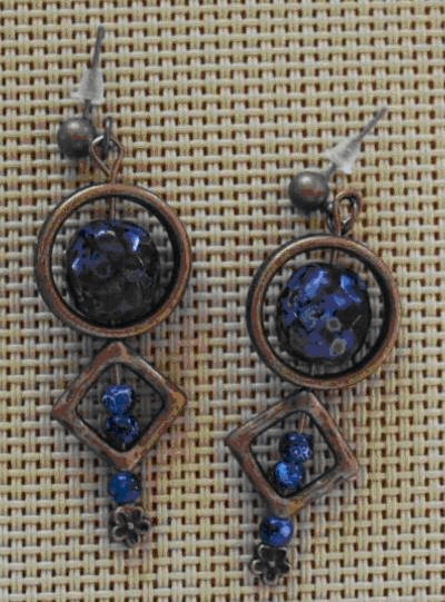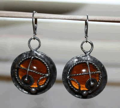 DÁVNOVĚK Pukané sklo, bezolovnatý cín s mědí, pocínovaný drát. Patinováno, leštěno ošetřeno antioxidantem, náušnicové háčky z chirurgické oceli. Velikost průměr 2,5 cm, na výšku včetně závěsu 3cm + háčky.   DETAIL1 |