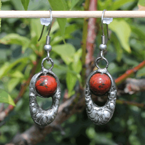 DRAČÍ OČI na přání Brekciový jaspis - korálky, bezolovnatý cín se stříbrem, pocínovaný drát. Náušnice jsou patinovány, leštěny a ošetřeny antioxidantem, háčky z chirurgické oceli.   DETAIL1 |