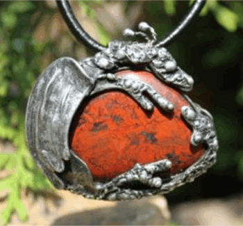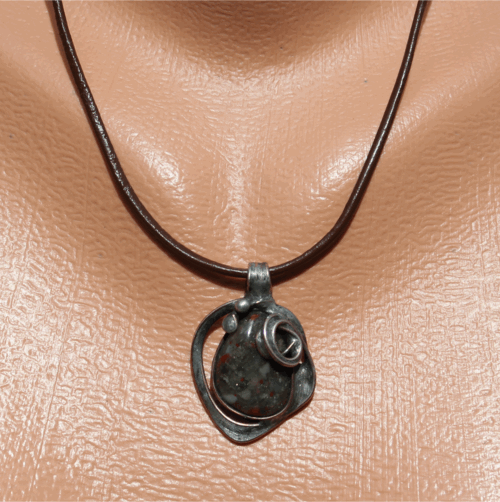 DRAGON Brekciový jaspis, bezolovnatý cín se stříbrem, pocínovaný drát. Přívěsek je patinován, leštěn a ošetřen antioxidantem. Dragon je zavěšen na černé kulaté kůži o délce 45 cm + adjustační řetízek 5 cm, vše z chirurgické oceli.  DETAIL1 |