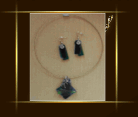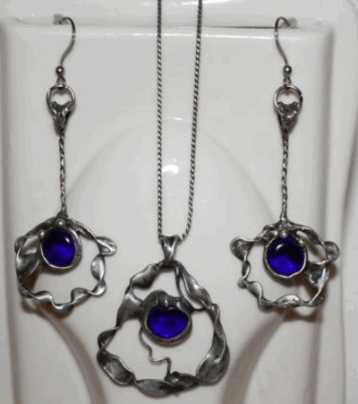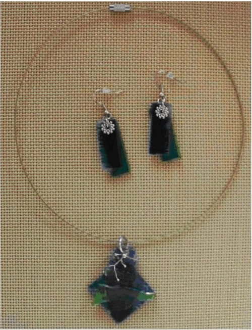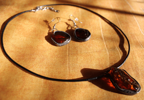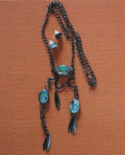 KYTIČKY - náušnice, náhrdelník Sklo, bezolovnatý cín s mědí, postříbřený drátek. Patinováno,leštěno, ošetřeno antioxidantem. Přívěsek je zavěšen na řetízku z bižuterního kovu, náušnicové háčky z chirurgické oceli.   DETAIL1 |