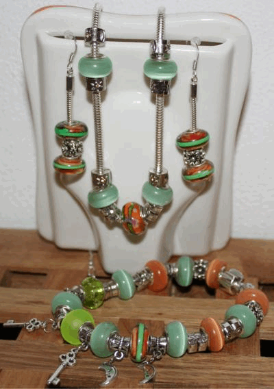 JARNÍ SOUPRAVA - na přání na Zelený čtvrtek Vinuté skleněné velkodírové korálky styl Pandora, kovové korálky a přívěsky, hadí řetízek, bižuterní kov v barvě platina, náušnicové háčky z chirurgické oceli.  DETAIL1 |
