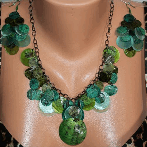 JEDU NA VODU - na přání Peleť z mušlí, přírodní placičky, penízky dobarvované, komponenty z bižuterního kovu v barvě antracit a zelené.  DETAIL1 |