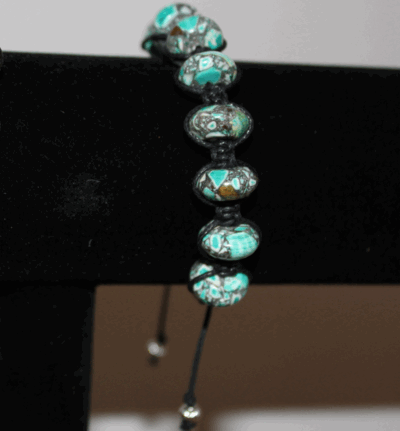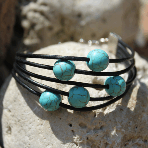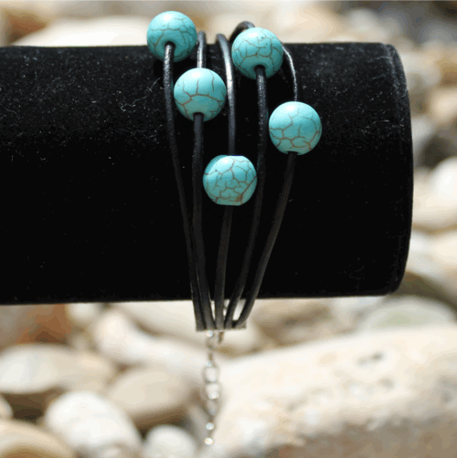 KAPKY ROSY - náramek Tyrkenit - korálky, černá kulatá kůže 2 mm, pětiřadý, řetízek, zapínání na karabinku + adjustační řetízek 4,5 cm v barvě platina. Velikost pro obvod 16 cm až 20 cm. Korálky jsou volně navlečeny na kůži, můžete si je libovolně posouvat dle chuti.  DETAIL1 DETAIL2 |
