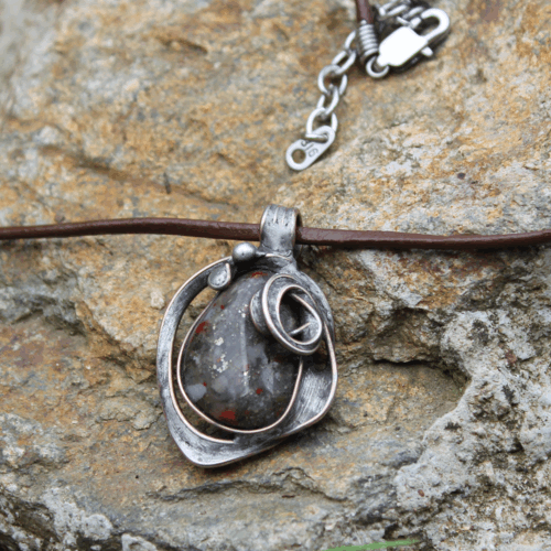 POKREVNÍ POUTO Heliotrop/krevel, bezolovnatý cín se stříbrem, pocínovaný drát, hnědá kůže, chirurgická ocel. Přívěsek o velikosti 2,7 cm x 3,7 cm včetně závěsu. Pokrevní pouto je zavěšeno na kůži 45 cm + 5 cm adjustační řetízek. Patinováno, leštěno a ošetřeno antioxidantem. Měděná patina je použita v závislosti na vlastnostech kamene.   DETAIL1 DETAIL2 |