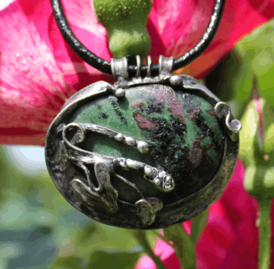 LESNÍ POKLAD Rubín v zoisitu, bezolovnatý cín se stříbrem, pocínovaný drát. Přívěsek je patinován, leštěn a ošetřen antioxidantem. Lesní poklad je zavěšen na černé kůži 45 cm + adjustační řetízek 5 cm z chirurgické oceli. Velikost přívěsku 5 cm x 4,5 cm včetně závěsu.  DETAIL1 |