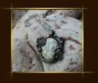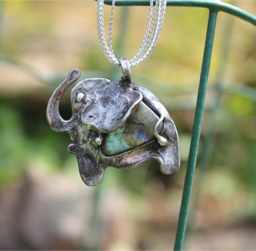 MAMUTÍK Tromlovaný labradorit s odlesky modré, zelené, žluté, bezolovnatý cín se stříbrem, pocínovaný drát. Přívěsek je patinován, leštěn a ošetřen antioxidantem. Mamutík je zavěšen na textilní lurexové šňurce 45 cm + adjustační řetízek 5 cm. Velikost přívěsku 3,5 cm x 3,5 cm včetně závěsu.  DETAIL1 |