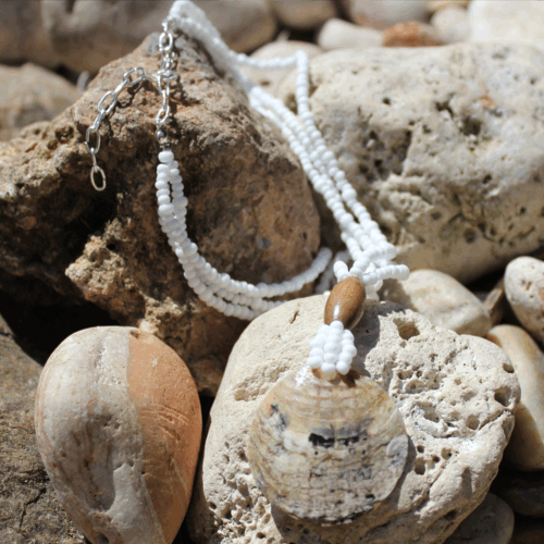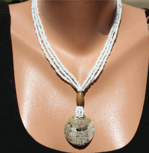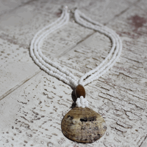 MOŘSKÝ PŘÍBOJ Přírodní perleťová placička o průměru 4 cm, skleněný rokajl bílý Preciosa, dřevěný korálek 1 cm x 2 cm. Velikost třířadého náhrdelníku k dřevěnému korálku 42 cm + adjustační řetízek 7 cm v barvě stříbra, zapínání na karabinku. Délka části od dřevěného korálku s placičkou 7 cm.  DETAIL1 DETAIL2 DETAIL3 |