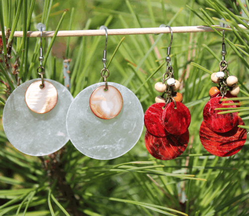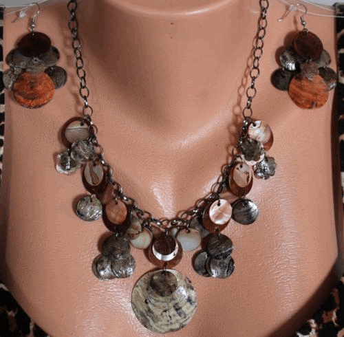 NA BŘEHU - na přání Peleť z mušlí, přírodní placičky, penízky dobarvované, komponenty z bižuterního kovu v barvě antracit, náušnicové háčky z chirurgické oceli.  DETAIL1 |