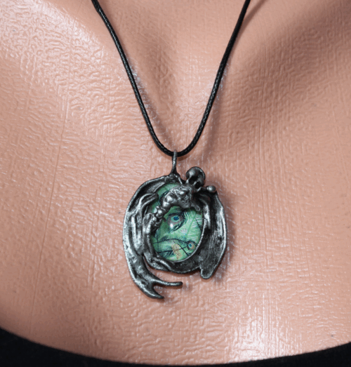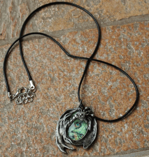 PAVÍK Skleněný kabošon s motivem pavích per, bezolovnatý cín s mědí. Přívěsek je patinován, leštěn, ošetřen antioxidantem. Pavík je zavěšen na textilní šňůrce 45 cm + 5 cm adjustační řetízek z bižuterního kovu. Velikost přívěsku 3 cm x 4,5 cm včetně závěsu.  DETAIL1 DETAIL2 DETAIL3 |