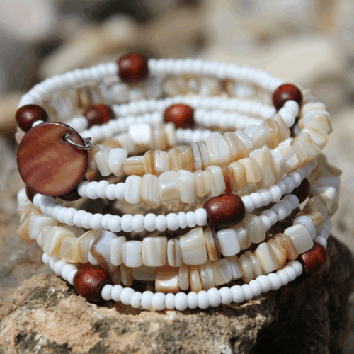 PERLEŤOVÝ náramek - na přání Perleť z mušlí - zlomky, placička, bílý rokail, dřevěné korálky, nerezový paměťový drát.  DETAIL1 |