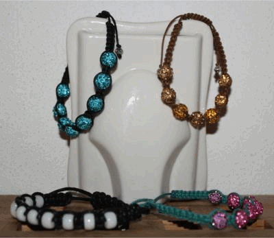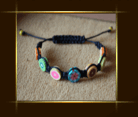 SHAMBALLA Drhaný náramek, polymerové korálky, skleněné korálky, bavlněná šňůrka, kovové korálky. Růžový a bílý.  DETAIL1 |