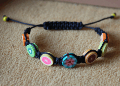 PRO SLEČNU - náramek na přání Fimo korálky - ovoce a kytičky, žluté skleněné korálky, bavlněná šňůrka, drhaný náramek typu shamballa.  DETAIL1 |