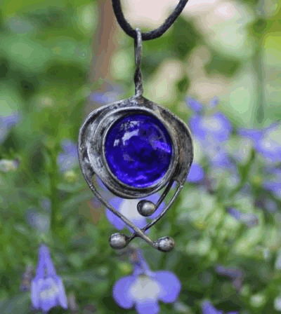 STUDÁNKA + náušnice na přání Pukané sklo, bezolovnatý cín s mědí, pocínovaný drát, patinováno, leštěno, ošetřeno antioxidantem, kůže. Velikost přívěsku 3 cm x 5 cm včetně závěsu. Náušnice modré skleněné nugety 2 cm, cín, mechanické háčky z chirurgické oceli.  DETAIL1 |