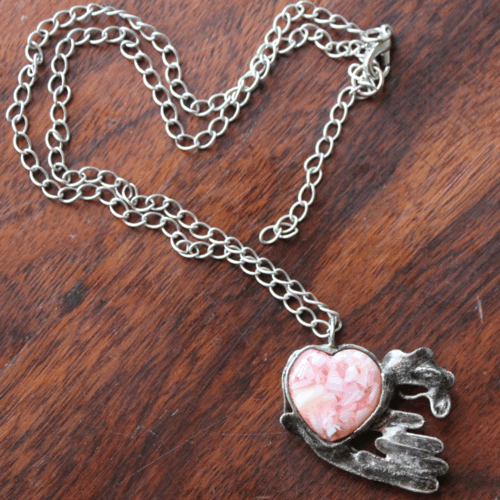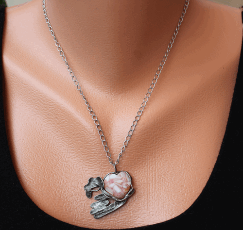 TAKOVÁ JE LÁSKA Perleť z mušlí ve tvaru srdce, bezolovnatý cín s mědí, pocínovaný drát. Přívěsek je patinován, leštěn, ošetřen antioxidantem. Přívěsek je zavěšen na řetízku z bižuterního kovu 45cm + 5cm adjustační řetízek. Velikost přívěsku 4 cm x 4 cm včetně závěsu.  DETAIL1 DETAIL2 DETAIL3 |