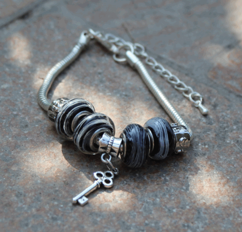 TŘINÁCTÁ KOMNATA Náramek typu Pandora, černobílé skleněné vinutky, přívěsek klíč, kovové korálky, Pandora řetízek.  DETAIL1 |