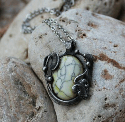 VÍRA Upravený bílý kámen, bezolovnatý cín s mědí, pocínovaný drát. Patinováno, leštěno, ošetřeno antioxidantem. Řetízek z chirurgické oceli 45 cm + 5 cm.  DETAIL1 |