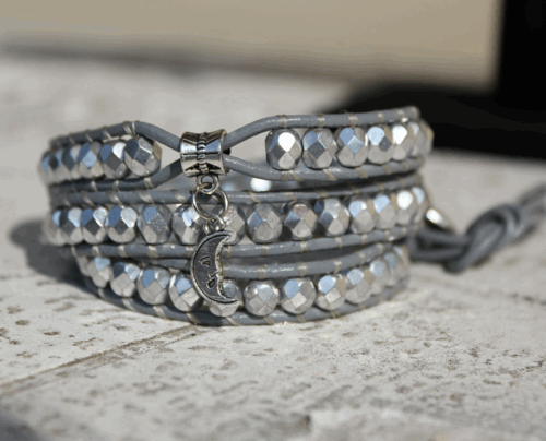 WRAP MĚSÍČNÍ TŘPYT tříŘADÝ Šedá kůže, skleněné korálky stříbrné pokovené, S-lon, přívěsek měsíc, kovový knoflík.  DETAIL1 |