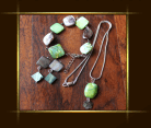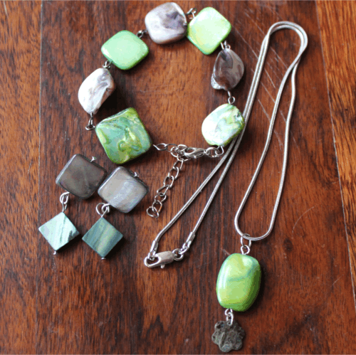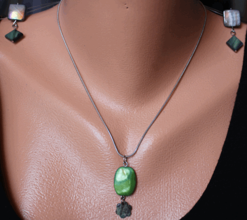 ZELENÁ VÍLA - náušnice, náramek, náhrdelník Perleť z mušlí - korálky, kytička a přírodní čtverečky, hadí řetízek ve stříbrné barvě 42 cm, přívěsek o velikosti 1,5 cm x 4 cm, náušnice 4 cm, puzetky z chirurgické oceli, náramek s obvodem 17 cm + prodlužovací řetízek 4,5 cm, bižuterní kov.  DETAIL1 DETAIL2 |