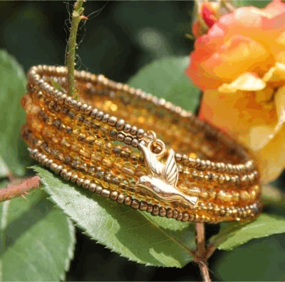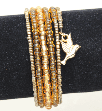 ZLATÝ - náramek Skleněné korálky, přívěsek z bižuterního kovu v barvě zlata,paměťový drát.   DETAIL1 DETAIL2 |