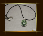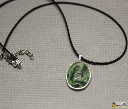 Amulet Pavího krále Skleněný kabošon s motivem pavích per 25 x 18 mm, lůžko postříbřeno Ag, přívěsek visí na textilním náhrdelníku 45 cm, zapínání bižuterní kov.   DETAIL1 |
