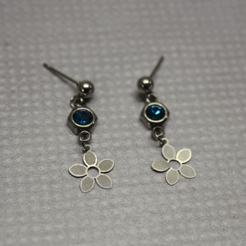 BLUE ZIRCON Visací náušnice o délce 2,5 cm + puzetky kulička, konektor s broušeným kamínkem, laserem řezaná kytička, silikonové zarážky. Všechny komponenty z chirurgické oceli 316L.   DETAIL1 |