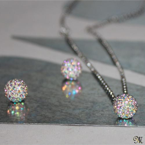 Kuličky Štrasové korálky jsou ručně vykládané českými šatonovými kamínky crystal AB značky Preciosa, vyrobené z broušeného olovnatého skla. Soupravu „Kuličky“ tvoří náušnice, puzetky a náhrdelník s přívěskem. Všechny použité komponenty jsou z chirurgické oceli.   DETAIL1 |