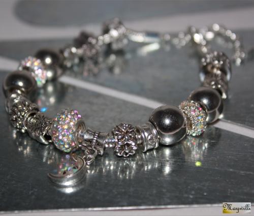 Měsíční třpyt Náramek s nápadným štrasovým korálkem crystal AB, štrasovými válečky crystal, přívěskem měsíc, kovovými korálky různých typů a tvarů dle obrázku, bižuterní kov v barvě stříbra, starostříbra. Univerzální velikost díky prodlužovacímu řetízku, zapínání na karabinku.  DETAIL1 |