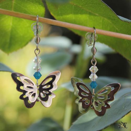 Motýl tyrkys Visací náušnice 2,7 mm, motýlci a všechny komponenty z chirurgické oceli, korálky Swarovski v barvě tyrkysové a crystal, afroháčky, silikonové zarážky.  DETAIL1 |