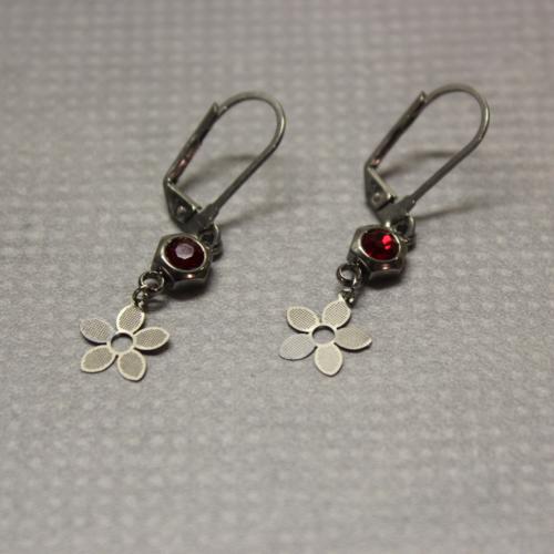 RED ZIRCON Visací náušnice o délce 2,5 cm + mechanické háčky, konektor s broušeným kamínkem light siam, laserem řezaná kytička, silikonové zarážky. Všechny komponenty z chirurgické oceli 316L.   DETAIL1 |