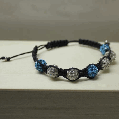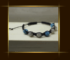 Shamballa stribrnomodry Drhaný náramek, polymerové korálky stříbrné a modré s šatony 10mm, bavlněná šňůrka černá 1mm, kovové korálky. Velikost nastavitelná posuvným drhaným zapínáním.  DETAIL1 |