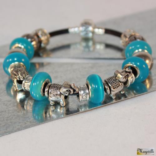 Slonečci Náramek s velkodírovými skleněnými perlami- kočičí oči, kovové korálky, korálky - sloni v barvě starostříbro, kovové stoppery, černý kožený náramek.   DETAIL1 |