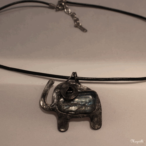 Sloník kyanitový Kyanit - disthen přírodní, bezolovnatý cín s příměsí stříbra, drát, patinován, leštěn, povrchově ošetřen. Černá kulatá kůže, velikost náhrdelníku 45 cm + 5 cm adjustační řetízek, velikost Sloníka 3,5 cm x 3,5 cm. Všechny komponenty z chirurgické oceli 316L.  DETAIL1 |
