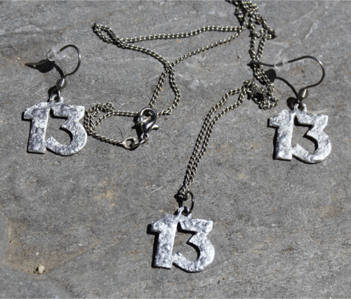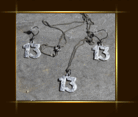 Třináctka pro štěstí Měděný výsek 15 x 18 mm, smalt strukturovaný bílý a černý, bižuterní kov v barvě starostříbro, náušnicové háčky z chirurgické oceli, silikonové zarážky. Délka řetízku 50 cm + přívěsek.  DETAIL1 |