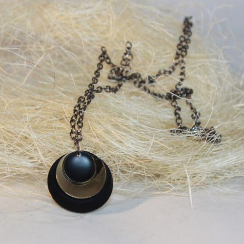 Zatmění slunce Přívěsek tvoří 3 mělké mističky z plastu, 2 černé (25 a 15 mm) a 1 leštěná zlatá (20 mm). Jsou volně spojeny kroužkem. Zatmění slunce je zavěšeno na řetízku v barvě gun metal z bižuterního kovu 52 cm.  DETAIL1 |